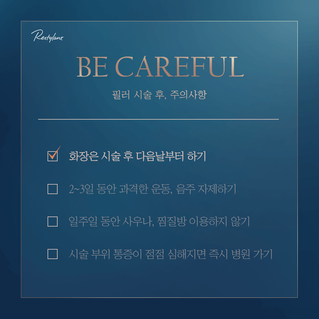 news contents 필러 시술 후 주의사항 레스틸렌 2021. 10. 27. 14:30 필러 시술 후, 꼭 지켜야 하는 네 가지! 레스틸렌®과 함께 기억해요.KR-RES-2100262_231019#필러 #체크리스트 #레스틸렌 #히알루론산필러 #마이초이스레스틸렌라인즈 #restylane #시술후주의사항 공유하기 게시글 관리 레스틸렌 저작자표시 비영리 변경금지 (새창열림) 'contents' Related Articles 건강한 두피 관리법 모공을 줄이는 생활 습관 안전성이 입증된 레스틸렌® 인생 사진을 위한 홈-뷰티 팁